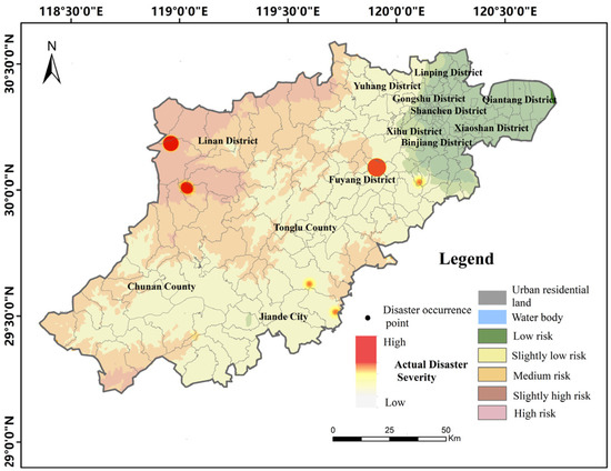 According to the location and affected area of the tea frost hazard in the Hangzhou Disaster Prevention and Mitigation Basic Database, a spatial display was carried out on the frost risk zoning of tea in Hangzhou (taking tea with weak cold resistance as an example) (Figure 9). The change from grey to red indicates an increase in the severity of the hazard, and the size of the area indicates the affected area. To facilitate the comparison of the tea frost hazard risk results, the hazard data were set to 30% transparency. By extracting the data of actual hazard occurrence points and comparing the results of the traditional method and the random forest model method, the deviation between the two methods was only 1.57%. The overall risk distribution of the two methods is consistent, only slightly different in mountainous areas, which further verifies the reliability of the random forest model.