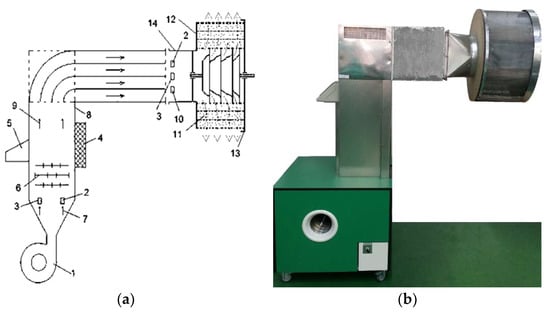Laboratory dryer scheme with the cylindrical baffled drying unit. (a)—functional scheme, (b)—general view, 1—fan; 2—temperature sensor; 3—humidity sensor; 4—isolating layer; 5—control panel; 6—electrical resistances; 7—cold air; 8—body; 9—hot air; 10—velocity sensor; 11—drying cells; 12—fixed cover; 13—mobile cover; 14—change of section.