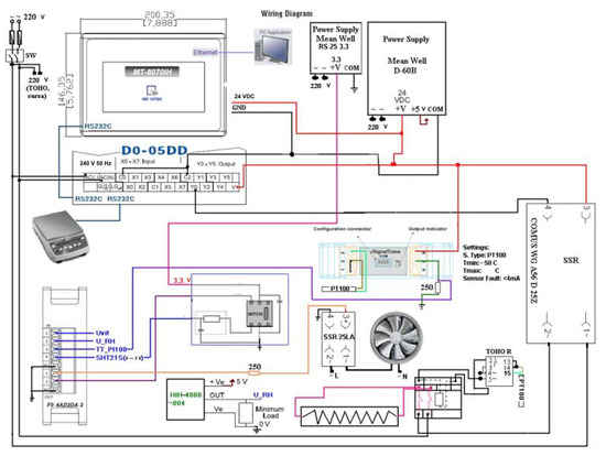 A PID (proportional integral derivative) controller automation system, which regulates the temperature of the heating air, was installed in the system. The automation system’s LCD screen was used to configure, record, and display the drying agent’s temperature, humidity, and velocity. This enabled the recording of the temperature-time diagram as well as the date and time that the drying cycle started and concluded [27]. The drying plant electrical scheme is presented in Figure 2.