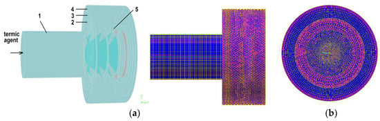 Cylindrical dryer meshing. (a)—defining the control volume; 1—heat duct, 2—first seed layer, 3—second layer, 4—third layer, 5—deflectors. (b)—cylindrical meshing.