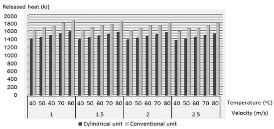 It is evident that the amount of heat released reduces at greater fan velocities and increases with temperature. The fact that the emitted heat has lower values for each temperature and velocity in the case of the cylindrical unit is crucial. The values decreased from 12.90% to 15.38%. (Figure 6).