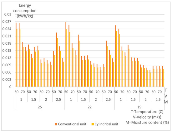 Roughly speaking, as temperature and air velocity rise, the energy requirement declines. For temperatures up to 60 °C, higher values were found. Each time the cylindrical unit was employed, the energy requirement was reduced. The energy values decrease by 9.41% to 14.89% when using this new unit.