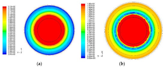 The cross-section representations for the first simulation version (v = 2 m/s; T = 313 K = 40 °C). (a) Temperature field (K); (b) absolute humidity field (kg water vapors/kg dry product) [20].