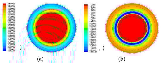 The cross-section representations for the second simulation version (v = 2 m/s; T = 343 K = 70 °C). (a) Temperature field (K); (b) absolute humidity field (kg water vapors/kg dry product) [20].