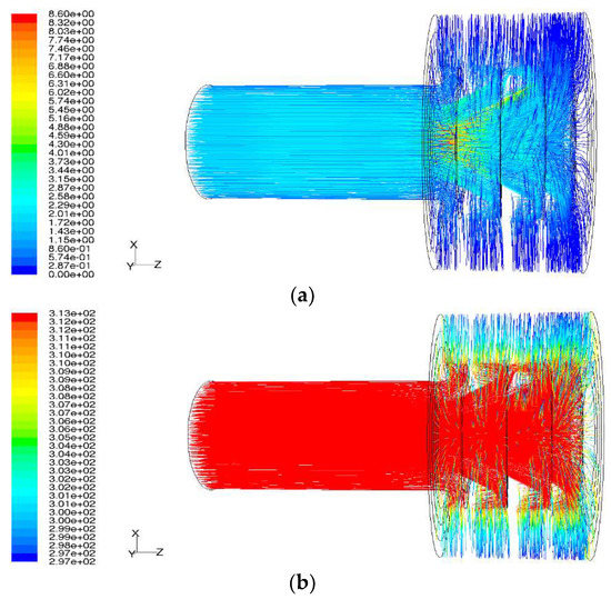 The current line fields inside the cylindrical box with baffles and three layers for the first version (temperature of 313 K = 40 °C): (a)—velocity (m/s); (b)—temperature (K) [32].