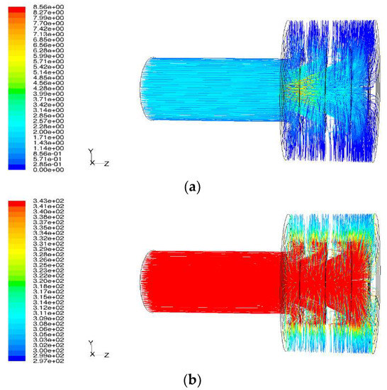The current line fields inside the cylindrical box with baffles and three layers for the second version (temperature of 343 K = 70 °C): (a)—velocity (m/s); (b)—temperature (K) [30].