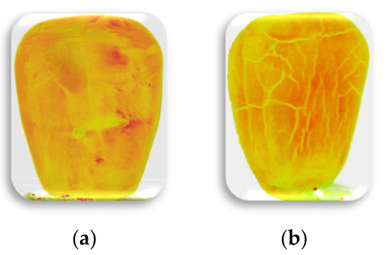 Dehydrated corn seed longitudinal scanned sections. (a). T = 40 °C; v = 2.5 m/s; (b). T = 80 °C; v = 1 m/s.