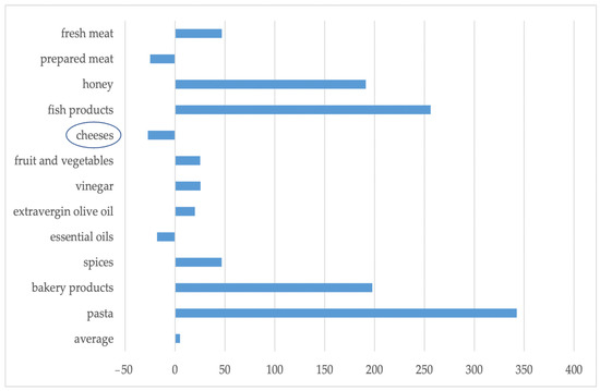 Figure 2 illustrates the first results of the empirical analysis by providing an overview of the natural rates of growth of all GI products. As shown in the figure, a positive Narg emerges, witnessing an increase in the total number of operators in the GI system. This confirms that the protected designation of origin and protected geographical indications continue to attract many farmers and processors in origin-linked quality circuits. Accordingly, GIs still offer a fundamental contribution to sustainable agrifood systems and boost sustainable rural development. Nonetheless, an in-depth analysis focussed on the dairy sector pointed out clear differences. Although there are sectors with very high performance, such as pasta, fish and bakery products, on the other side, a clear contraction in the adhesion to the dairy GI sector is evident. In the time period of reference, GIs linked to the livestock and dairy sectors show a negative trend in the adhesion; an exception is the case of honey. In the cheese sector, we can observe a very negative rate (−25,0), pointing out a negative performance in the operators working in the GIs circuits.