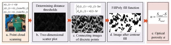 Canopy porosity is divided into optical porosity and volumetric porosity. Optical porosity refers to the ratio of the void area in the plant canopy to the area of the canopy. Volumetric porosity refers to the ratio of the volume of the voids to the total volume. The porosity affects the penetration ratio of the droplets of air-assisted sprayers. Optical porosity can be regarded as the result of volumetric porosity in the projection plane and reflects the openness of the plant canopy. It is easier to obtain than volumetric porosity. Therefore, we calculated the optical porosity of the canopy to characterise it. The procedure for calculating optical porosity is shown in Figure 1.