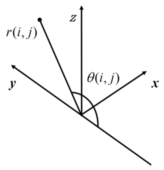 The laser point cloud data was obtained from a LIDAR scanning sensor and processed in the Visual Studio 2015 software. The data were acquired in a scanner-centric polar coordinate system and had to be converted into a Cartesian coordinate system. The polar coordinate system in which the LIDAR data were collected is shown in Figure 2, where θ is the laser beam angle, r is the distance, x is the moving direction of the LIDAR instrument, y is the scanning direction, and z is the direction perpendicular to the ground.