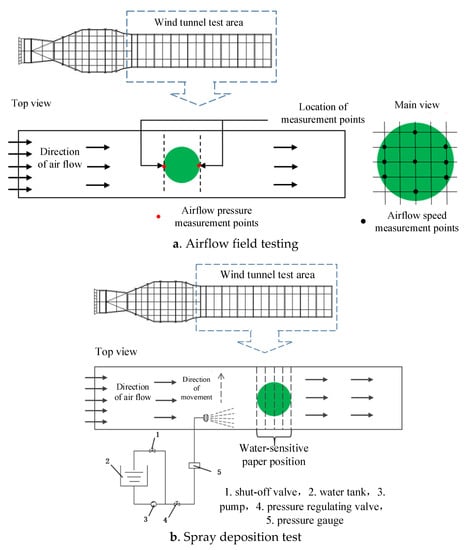 The canopy airflow field test and the droplet penetration test were carried out in a BLWT-2000/1750 DC low-speed wind tunnel at Nanjing Forestry University. The test section was 10 m long with a cross-sectional area of 2 m × 2 m, and wind speed adjustment range of 0.5~10 m/s. The canopy airflow field was measured using a multi-point anemometer (Kanomax, model 6242, Suita, Japan). Its probe was attached to a pole that moved along the rail. A programmable controller powered by a stepper motor controlled the linear movement of the probe on the pole to achieve high-accuracy positioning and movement. The droplet penetration test system consisted of water-sensitive paper (water-sensitive paper WPS, 26 mm × 76 mm, Spraying System Co., Wheaton, IL, USA) to collect the droplets and a spray system (including a water tank, electric diaphragm pump, pressure-regulating valve, pressure gauge, piping, spray nozzle mounting bracket, spray nozzle, and spray movement control device). Figure 3 and Figure 4 show the diagrams of the airflow field and spray deposition test systems in the wind tunnel to investigate the effect of the airflow speed and porosity on the droplet penetration ratio.