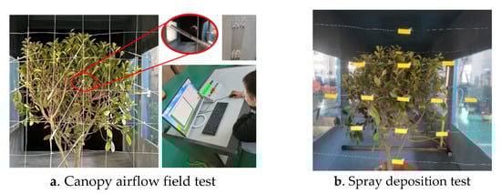 Pest and disease control are critical aspects of fruit tree cultivation and ensure high fruit quality [1,2]. Fruit trees are treated at least five to eight times a year during the growth cycle, and the application quality affects fruit yield and quality [3,4]. Fruit tree depression and canopy parameters affect the application performance. The leaves at the outer of the canopy block the spray droplets, preventing the spray from entering the interior. Thus, it is difficult to achieve an even distribution of the pesticide and a satisfactory performance [5,6,7,8,9]. The fan in the spraying equipment generates strong airflow to deliver the atomised liquid into the canopy of fruit trees, improving the pesticide utilisation and reducing environmental pollution. Therefore, it is crucial to investigate the penetration characteristics of the airflow in the canopy to optimise the operational parameters of the spraying equipment to achieve precise pesticide application and improve the effectiveness of fruit tree pest and disease control [10,11].