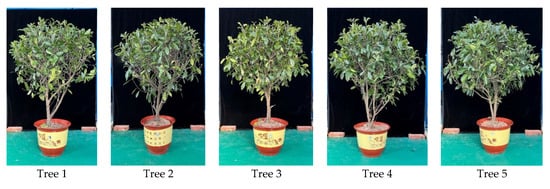 The trees used in this experiment were Fortunella margarita with regular shapes and different densities, as shown in Figure 5. The LIDAR sensor was mounted on a horizontal synchronous belt driven by a stepper motor and moved at a constant speed. It was connected to a PC. The LIDAR control program was started, and the network parameters and scanning parameters were set. The LIDAR sensor began to scan the trees. The effective travel length of the rail slide was 1.5 m, and the speed was adjustable. We installed the LIDAR sensor to focus on the centre of the tree crown. The start angle was 135°, and the end angle was −135°. The LIDAR scanning distance, i.e., the distance from the LIDAR to the tree trunk, was 1.5 m. The minimum travel speed of an orchard sprayer is 0.3 m/s. Therefore, we set the LIDAR moving velocity to 0.3 m/s. Point cloud data were acquired in real time in the dat format. We used MATLAB to write a point cloud processing program. The dat format was converted to a txt format using the Geomagic studio software to read and delete data outside of the area of interest. The final data were saved in a text format.