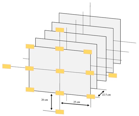 The LICHENG agricultural fan spray nozzle (type VP110-04) was used in the spraying tests of the five trees to investigate the effect of different optical porosities and wind speeds on the droplet penetration ratio and distribution. The spray nozzle and pipe were attached to a vertical bar using a connector. The spraying was controlled by a stepping motor that drove a synchronous belt to move the vertical bar and slider in a uniform and linear movement. The spraying pressure was controlled by a pressure-regulating valve. The wind tunnel wind speed was set to 5 m/s, 6 m/s, 7 m/s and 8 m/s, and the nozzle height from the ground and the canopy was 95 cm and 50 cm, respectively, with a moving speed of 0.3 m/s, a spray pressure of 2.5 MPa, a flow rate of 24 mL/s, and a spray direction along the wind tunnel airflow direction, mimicking the actual operating parameters of the 3WG-8 orchard wind-driven sprayer. The droplet collection points in the canopy were configured as follows. The canopy was divided into five equal layers from front to back in the spray direction, and the layers were spaced 22.5 cm apart. Thirteen measurement points were located at the top and bottom of each layer, and the points were spaced 20 cm apart at the top and bottom and 25 cm apart left and right, resulting in 65 measurement points, as shown in Figure 6. Water-sensitive paper was placed at the measurement points to collect the droplets; the water-sensitive paper was placed perpendicular to the spray direction. After the test, the droplets on the water-sensitive paper was collected and stored in a sealed container after drying. The water-sensitive paper is scanned by the scanning software and the scanned image was analysed using the special image processing software DepositScan to obtain the amount of droplet deposition and coverage, which can be used to calculate the amount of droplet deposition (mg/cm2) for later analysis of droplet penetration and distribution patterns.