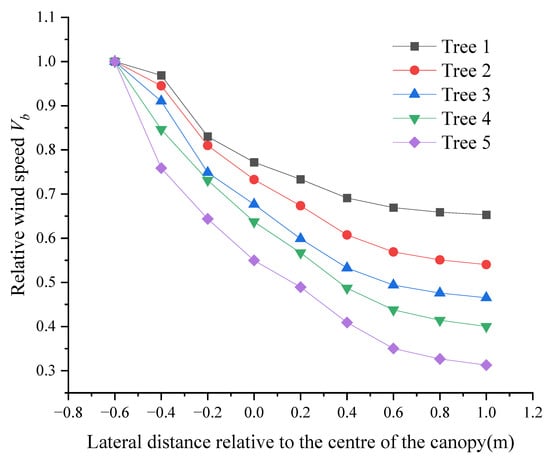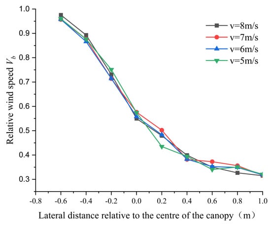 The wind-fed airflow size variation in the canopy front and rear within −0.6 m~1 m at the canopy centre height under the incoming wind speed of 8 m/s is shown in Figure 7. The horizontal coordinate is relative to the lateral measurement position of the canopy centre, where the horizontal coordinate 0 represents the canopy centre position, and the direction closer to the wind tunnel outlet is negative and the reverse is positive; the vertical coordinate is the relative wind speed, which is the normalised value of the wind speed test data of different experimental trees and can be more convenient to analyse the influence of different parameters on the airflow of wind delivery. The relative wind speed divides the wind speed at the measurement point by the incoming wind speed at the same height in the wind direction above the canopy, as shown in Equation (4).