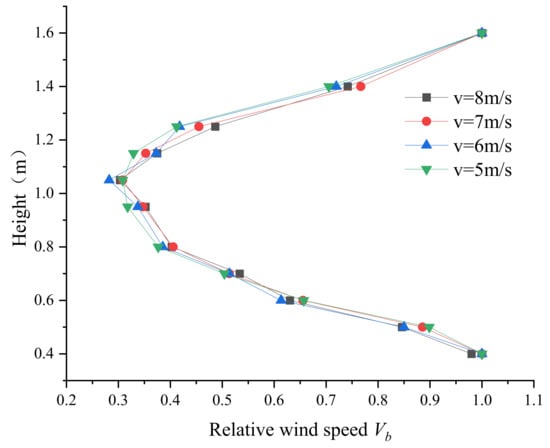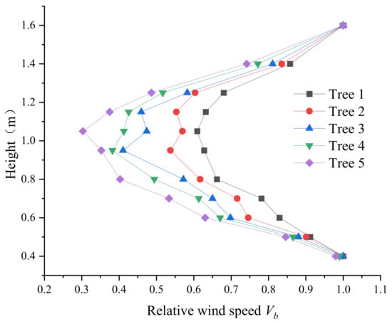 The wind speed profiles of tree 5 measured at 0.1 m behind the canopy at incoming wind speeds of 5 m/s, 6 m/s, 7 m/s, and 8 m/s are shown in Figure 10. The relative wind speed decreases before increasing with the height, and the minimum wind speed occurs at the maximum canopy thickness (approximately 1 m in height). The trend of the relative wind speed across the canopy is very similar for different incoming wind speeds, indicating that the higher the incoming wind speed, the greater the airflow velocity is inside and outside of the canopy and the greater the penetration capacity is.
