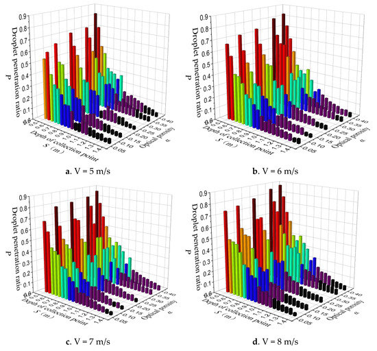 When the collection point depth and optical porosity are constant, the droplet penetration ratio increases with the incoming wind speed. The maximum droplet penetration ratio was 0.88051 at V = 8 m/s. When the porosity and incoming wind speed are constant, the droplet penetration ratio decreases as the collection point depth increases because of the attenuation of the airflow. For example, as shown in Figure 11a, = 0.40576 and S = 0.5 m. The droplet penetration ratio was 0.82859, and as the depth of the collection point increased, the droplet penetration ratio decreased to 0.11109 at S = 1 m. The same trend was observed for other values of . When the collection point depth and incoming wind speed are constant, the droplet penetration ratio also decreases as the optical porosity decreases due to the blocking effect of the canopy. For example, in Figure 11a, the droplet penetration ratio was 0.82859 for S = 0.5 m,= 0.40576 and decreased to 0.53999 when the porosity decreased to 0.06594. The same trend was observed for other values of S. Despite measurement errors, the same trends are observed at V = 6 m/s (Figure 11b), V = 7 m/s (Figure 11c), and V = 8 m/s (Figure 11d). Thus, we can conclude that as wind speed increases, the percentage of droplet penetration also increases, and the percentage of droplet penetration is more sensitive to changes in the depth of the collection point than the optical porosity. A similar pattern of variation in droplet penetration is observed for different wind speeds as the depth of the collection point and the optical porosity change, and it is also observed that the higher the wind speed, the higher the percentage of droplet penetration, all other things being equal.