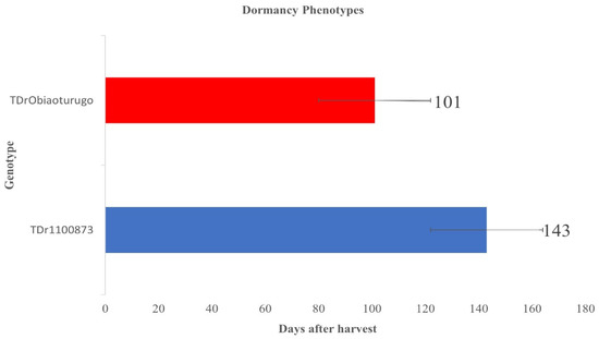 The two genotypes exhibited different dormant genotypes. Figure 1 shows the result of t-test analysis at (p = 0.05) and it indicates that the local genotype Obiaoturugo had a shorter dormancy duration, and sprouted on 101-DAPM, compared to the improved genotype (TDr1100873) which sprouted on 143-DAPM demonstrating its longer dormant phenotype with a 42-day difference.