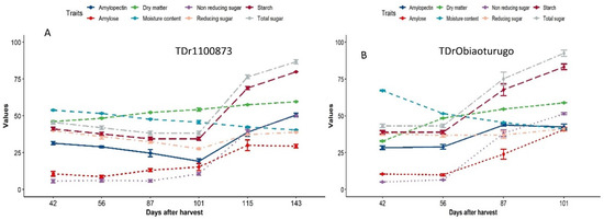 (A,B) Metabolic changes in non-structural sugar, dry matter, and moisture content in two white yam genotypes’ tubers from dormancy to sprouting. (A) The data for TDr1100873 and (B) the data for Obiaoturugo. Error bars indicate statistically significant differences among the variables at p ≤ 0.05. The six sugar parameters, dry matter, and moisture content are shown with colored lines, their values are on y-axis (multiple parameters with different units are shown on the same axis; hence, no unit was attached to the values). Total sugar, starch, reducing and non-reducing sugars, amylose, and amylopectin were all measured in mg/100 mg as units, whereas dry matter and moisture were measured in percentage as units. The values on x-axis are days after tuber physiological maturity.