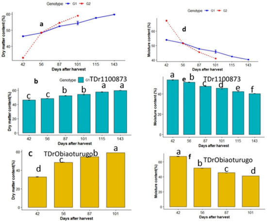 (a–f) Changes in dry matter and moisture content in tubers of two white yam genotypes (TDr1100873 and Obiaoturugo) from tuber physiological maturity to sprouting. Bars with the same letters are not significantly different, while those with different letters are significantly different at p = 0.05. (a) Comparison of dry matter content in the tubers of G1 = TDr1100873 (blue line) and G2 = Obiaoturugo (red line) at all the studied dormancy stages. (b) Changes in dry matter content in the tubers of TDr1100873 across the studied stages. (c) Changes in dry matter content in the tubers of Obiaoturugo across the studied stages. (d) Comparison of moisture content of G1 = TDr1100873 (blue line) and G2 = Obiaoturugo (red line) at all the studied dormancy stages. (e) Changes in moisture content in the tubers of TDr1100873 across the studied stages. (f) Changes in moisture content in the tubers of Obiaoturugo across the studied stages.