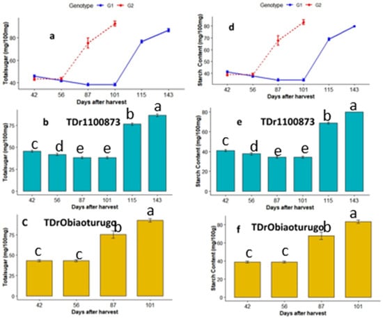(a–f) Total sugar and starch metabolic status in tubers of two white yam genotypes (TDr1100873 and Obiaoturugo) from physiological maturity to sprouting. Bars with the same letters are not significantly different, while those with different letters are significantly different at p = 0.05. (a) Comparison of total sugar content in the tubers of G1 = TDr1100873 (blue line) and G2 = Obiaoturugo (red line) at all the studied dormancy stages. (b) Changes in total sugar content in the tubers of TDr1100873 across the studied stages. (c) Changes in total sugar content in the tubers of Obiaoturugo across the studied stages. (d) Comparison of starch content in the tubers G1 = TDr1100873 (blue line) and G2 = Obiaoturugo (red line) at all the studied dormancy stages. (e) Changes in starch content in the tubers of TDr1100873 across the studied stages. (f) Changes in starch content in the tubers of Obiaoturugo across the studied stages.