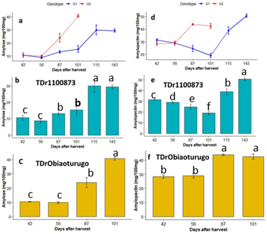(a–f) Amylose and amylopectin metabolic status in tubers of two white yam genotypes (TDr1100873 and Obiaoturugo) from physiological maturity to sprouting. Bars with the same letters are not significantly different, while those with different letters are significantly different at p = 0.05. (a) Comparison of amylose content in the tubers of G1 = TDr1100873 (blue line) and G2 = Obiaoturugo (red line) at all the studied dormancy stages. (b) Changes in amylose content in the tubers of TDr1100873 across the studied stages. (c) Changes in amylose content in the tubers of Obiaoturugo across the studied stages. (d) Comparison of amylopectin in the tubers G1 = TDr1100873 (blue line) and G2 = Obiaoturugo (red line) at all the studied dormancy stages. (e) Changes in amylopectin content in the tubers of TDr1100873 across the studied stages. (f) Changes in amylopectin content in the tubers of Obiaoturugo across the studied stages.