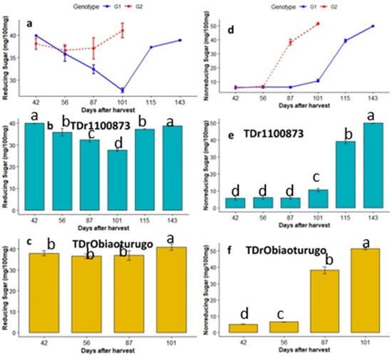Metabolic changes in reducing and non-reducing sugars in the two white yam genotypes during tuber dormancy are presented in Figure 6a–f. Figure 6a shows that Obiaoturugo recorded higher reducing sugars than TDr1100873 at all studied dormancy stages, except at 42-DAPM and 56-DAPM. In both genotypes, there was a decrease in reducing sugar at 42-DAPM, 56-DAPM, and 101-DAPM. After which, steady increases were observed until the tubers sprouted at 101-DAPM and 143-DAPM, in Obiaoturugo and TDr1100873, respectively. Figure 6b shows that there was a significant change in the reducing sugar content in the tubers of TDr1100873 between the 87-DAPM and 101-DAPM stages only. The highest reducing sugar content was observed at 42-DAPM, whereas the lowest reducing sugar content was observed at 101-DAPM. Figure 6c shows no significant difference in changes in reducing sugar content in the tubers of Obiaoturugo across the studied points, except at 101-DAPM (sprouted tuber).