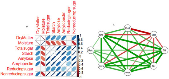 (a,b) Correlation matrix showing linear relationships between non-structural sugar parameters, dry matter, and moisture content in yam tubers from dormancy to sprouting. Both a and b are visualizing the same relationships in different formats. In both figures, color shades indicate the degree of relationship between two variables connected in the box or on edge at p = 0.05. In (a), variables connected by blue are positively correlated to each other, while those connected by red are negatively correlated. In (b), variables connected to each other at the edge by green-green lines are positively correlated, while those connected by red and green lines are negatively correlated.