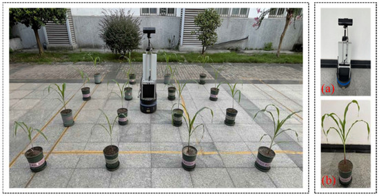 From 28 May to 27 June 2022, a maize population reconstruction experiment was conducted as part of this study at the Nanjing Agricultural University’s Pukou Campus. Maize seedlings were chosen as test objects. There were 16 plants in total, and the variety chosen was Zhenzhennuo 99. The row and column spacing of a single maize plant was 80 cm and the average initial plant height was approximately 30 cm; 96 sets of maize plant point cloud data were collected every five days. The test setup is illustrated in Figure 1.