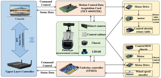 The key components of the self-propelled crop phenotyping system were a Kinect-based mobile ROS platform, motorized rotating table, control cabinet, graphics workstation, and mobile power supply. A schematic of the hardware of the measurement system is shown in Figure 2. The system was built using a 20 × 20 mm aluminum structure, 40 cm long, 40 cm wide, and 140 cm high. A 2.0 version of the Kinect sensor, mainly composed of color and depth cameras, was used. The resolution of the color camera was 1920 × 1080 pixels, and that of the depth camera was 512 × 424 pixels. The measurement distance was 0.5–4.5 m and the viewing area angle was 70 × 60° (horizontal × vertical). The electric rotary table was the TBR 100 series with a table size of 102 mm, angle range of 360°, worm gear ratio of 180:1, using a 42 M-1.8 D-C-10 stepper motor, whole step resolution of 0.01°, positioning accuracy of 0.05°, a circuit control cabinet built-in motion control data acquisition card, driver, and switching power supply. The motion control data acquisition card model was the NET6043-S2XE built-in 10/100 M adaptive Ethernet card, 8-way 16-bit positive and negative 10 V range single-ended analog synchronous acquisition, up to 40 KSPS. The 8-way analog can be synchronized with a two-axis logic position or encoder high-speed synchronous acquisition and two-axis stepper/servo motor control. The driver model is AQMD3610NS-A2, which supports analog signals of 0–5/10 V, signal ports that can withstand voltages of 24 V, and standard mode voltage protection of 485. The DashgoB1 series is an intelligent mobile platform that includes navigation, map construction, obstacle avoidance, and other features. It has an STM 32 chassis controller, built-in LIDAR, ultrasonic radar, and wheel speed encoder. A shock absorber was mounted on the front side of the chassis, and the bottom shell was mounted underneath the shock absorber. For the cart to adjust to an uneven path, the bottom shell also has a stabilizer bar inside it. The Intel(R) Xeon(R) E-2176M CPU @2.70 GHz, 32 G of memory and an NVIDIA Quadro P600 4G graphics card comprised the graphics workstation processor. For the Ubuntu 18.04 system, MATLAB R2019 programming was used as the programming environment for the hardware and software of the system.