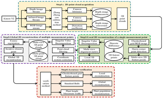 (5) The ICP technique and coarse alignment procedure of several measurement locations were used to accomplish the global 3D reconstruction of the crop population. In this work, the checkerboard grid, standard sphere, plant height, and maximum width were used to calibrate the local, global, and crop group reconstruction accuracies, respectively.