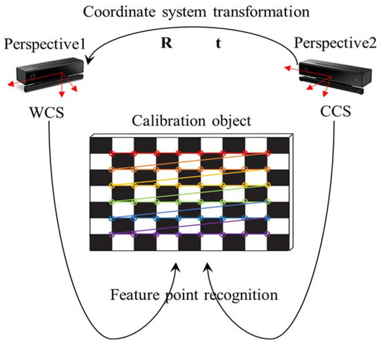 In this study, the multi-view alignment matrix was pre-calibrated for a single measurement point using the singular value decomposition approach. The specific pre-calibration procedure is shown in Figure 5. The KincetV2 camera was mounted on the TBR 100 motorized rotary table to capture the RGB images of the checkerboard grid at two different viewing angles of 0° and 45° in the first stage. In the following stage, 2D points (X, Y) were generated in accordance with the mesh grid using the Harris corner detection technique to identify the 2D feature corner points of the RGB images of the checkerboard grid from the two viewpoints. In the third stage, discrete differences were used to determine the mapping relations Fx and Fy between the 2D and 3D points, and the corresponding 3D feature points were computed using the 2D feature points of the checkerboard grid. The center of mass of the neighboring view feature points is determined in the fourth step using Equations (3) and (4), and the singular value decomposition method is applied to solve the rotation matrix R and translation matrix T of the 45° view transformation to the 0° view (there is no need to repeat the calibration subsequently; it is sufficient to calibrate once).