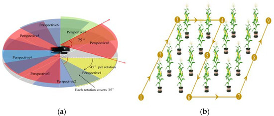 To guarantee an adequate overlap area between the measurement points, nine measurement points were evenly distributed according to the spatial distribution of the corn plants. The horizontal distance between the consecutive measurement locations was fixed at 1.6 m for consistency. Figure 6b depicts the locations of the measurement points and the acquisition paths. The final step was to pre-calibrate the coarse alignment matrix of several measurement points. A checkerboard grid was established between the adjacent measurement sites, and the 2.3.2 algorithm was utilized to accomplish the pre-calibration of the coarse alignment transformation matrix between the adjacent measurement points. Because the target navigation point position was established, subsequent crop reconstruction and measurement did not require repeated calibration.