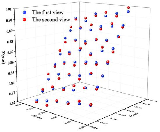 The tessellation grid feature points of the nearby views were used as measurement objects to assess the local 3D reconstruction accuracy of a single measurement point. The singular value decomposition approach was used to produce the tessellation grid 3D feature point matching and neighboring view alignment, and Figure 7 illustrates the 3D feature point matching accuracy analysis. The RMSE of the related tessellation 3D feature points was calculated as 0.18 cm, indicating that the reconstruction accuracy of the local 3D reconstruction was high.