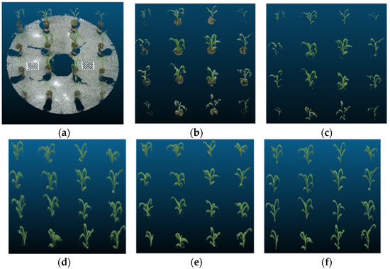 3D reconstruction process of crop plants. (a). Local 3D reconstruction; (b). direct filtering; (c). ultra-green component value denoising; (d). 3D point cloud coarse registration; (e). ICP fine registration; (f). radius filtering and statistical filtering denoising.