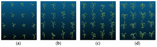 Global 3D point cloud model reconstruction of crop plants. (a). May 28th; (b). June 7th; (c). June 17th; (d). June 27th.