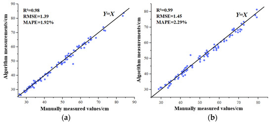 From Figure 10a, R2 = 0.98, RMSE = 1.39 cm, and MAPE = 1.92%, and the accuracy of the algorithm for measuring the plant height was 98.08%. As shown in Figure 10b, R2 = 0.99, RMSE = 1.45 cm, MAPE = 2.29%, and the accuracy of the algorithm for measuring the maximum plant width was 97.71%. The results in Figure 10 reveal that the algorithm measurement error of the maximum width is greater than that of the plant height, which is mostly due to the more involved manual measurement of the maximum width compared to the measurement of the plant height. The overall accuracy of this seedling maize population 3D reconstruction technique is excellent, and the algorithm measurements have a significant connection with manual measurements.