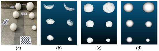 Standard sphere 3D point cloud model reconstruction. (a). Standard sphere RGB image; (b). local 3D reconstruction of the standard sphere; (c). global 3D reconstruction of the standard sphere; (d). standard sphere generation diagram.
