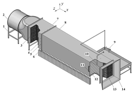 Wind tunnel for spray drift experiments: 1—frame; 2—suction fan with electric motor; 3, 13—air flow straighteners; 4, 11—window; 5—air velocity measurement place; 6—flask; 7—connection chamber; 8—investigation chamber; 9—spray supply equipment; 10—nozzle; 12—corrugated tin; 14—air intake section.