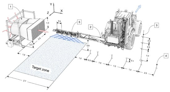 Setup for field spray drift experiments: 1—fans with frequency converters and air flow straighteners 0.25 m in length; 2—sprayer boom; 3—airborne spray drift setting rod with water sensitive paper attachment points; 4—ground spray drift stands with water sensitive paper attachment points; 5—nozzle. Note: ground spray drift stands at 10, 15, and 20 m away from the spraying area of the sprayer are not shown in the picture.