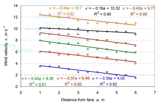 To determine the stability of the air flow, its speed moving away from the fan was studied. Five thermal anemometer FS5A sensors (Innovate sensor technology, Switzerland) were set at the height of the center of the fan blades and the width of the two fans, which was 2.0 m. The air flow speed was measured at a distance of 1.0–6.0 m every 1.0 m (Figure 4), moving away from the fans (Figure 3, in direction of the x axis). The results of the study are presented in Figure 5.