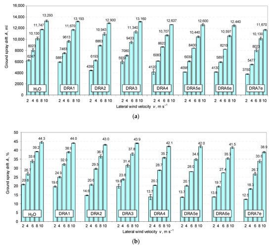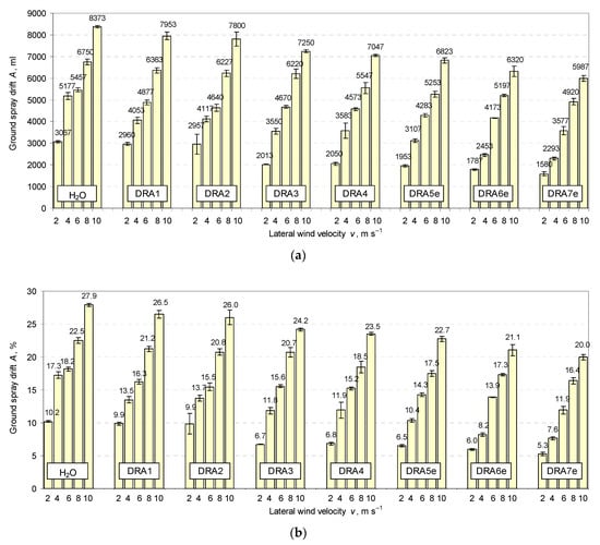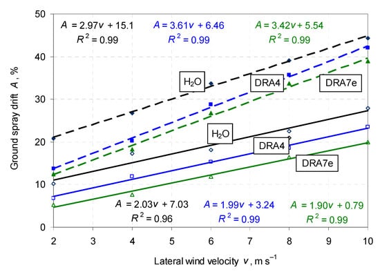 According to the experimental results, air velocity, solution, and nozzles have a major influence on ground spray drift. When comparing the air-injector flat spray nozzles with standard flat spray nozzles, there is a significant drift of the sprayed liquid: about two times higher with the standard flat spray nozzles (Figure 8). This result was not surprising as air-injector flat spray nozzles are known to generate larger droplets than standard flat spray nozzles. Larger droplets are less susceptible to winds due to their greater mass. Griesang et al. [] suggested that nozzle patterns influence droplet size characteristics and drift. Therefore, in some cases, the greater the reduction in drift, the more it is influenced by the nozzles rather than by the solution used. Itmeç et al. [] found that increasing the spray pressure from 3 bar to 5 bar increases the droplet drift of sprayed solutions. Hofman and Solseng [] state that the selection of suitable nozzles depending on the pesticide to be sprayed is particularly important. Our experimental studies demonstrated that for both nozzles studied, the lowest droplet drift was obtained when spraying the newly developed solution DRA7e, compared to two other newly developed solutions, four commercial solutions, and the control. The lowest droplet drift was found for solution DRA4 when comparing the commercial solutions with each other and with the control. When the commercial solution DRA4 was compared with the control when sprayed with air-injector flat spray nozzles at different lateral air velocities (from 2 m s−1 to 10 m s−1 at 2 m s−1 intervals), the droplet ground spray drift was found to be lower in the DRA4 solution by about 33, 31, 16, 18, and 16%, respectively (Figure 8). Under the same spray conditions, the droplet drift found for the DRA4 solution compared to the DRA7e solution was higher by about 22, 36, 22, 11, and 15% for the DRA4 solution, respectively. When the DRA4 solution was sprayed with standard flat spray nozzles at different lateral air velocities (from 2 m s−1 to 10 m s−1, at 2 m s−1 intervals), the droplet drift was found to be lower for DRA4 solution than for the control by about 34, 24, 15, 9, and 5%, respectively, and higher by about 9, 10, 7, 5, and 8%, respectively, than for DRA7e. With increasing lateral air velocity (from 2 m s−1 to 10 m s−1), the droplet ground spray drift increases in a linear dependence, while with a standard flat spray nozzle, the numerical value of the drift increases by ~3.5 percentage points with an increase in air velocity of 1 m s−1, and with an air-injector flat spray nozzle it increases by ~2 percentage points.