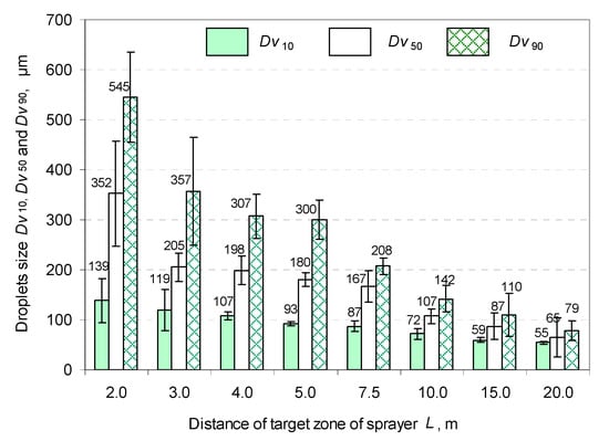 Droplet size parameters Dv10, Dv50, and Dv90 as a function from distance of target zone of sprayer L when spraying DRA7e with a sprayer with five air-injector flat spray nozzles (lateral wind velocity v = 10 m s−1).