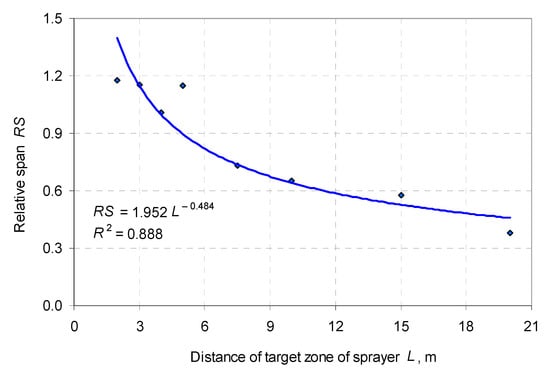 Relative span RS of droplets as a function from distance of target zone of sprayer L when spraying DRA7e with a sprayer with five air-injector flat spray nozzles (lateral wind velocity v = 10 m s−1).