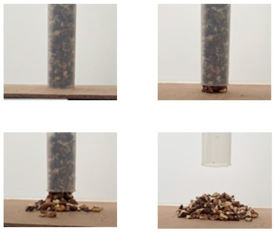 The Xinjiang paper-skinned walnut, purchased from a local supermarket in Yangling, Xianyang City, Shaanxi Province, was used in this experiment. The walnut shell was shelled manually, and the density of walnut kernels was 0.972 ± 0.016 g/cm3 []. The long diameter, short diameter, and height of whole kernels were 33 ± 2.20, 27.33 ± 1.25, and 23.66 ± 1.71 mm, respectively []. A cutting knife was then taken to make cylindrical samples with a length of 10 mm and a radius of 7, 8, 9, and 10 mm for the compression test. The long diameter, short diameter, and height of the cracking kernels were 10.79 ± 2.37, 7.12 ± 2.33, and 5.56 ± 1.77 mm, respectively. The cracking kernels were collected for the repose angle measurement.