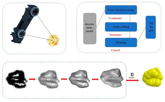 In the EDEM 2020 software, the Hertz–Mindlin model was applied to the repose angle simulation experiment. The Hertz–Mindlin model can calculate the motion and breaking of cracking kernels, as well as the bearing capacity between the sample particles. The main motions include the normal motion, tangential motion, and rolling motion between particles. To match the actual packing state, the cracking kernel model, shown in Figure 3, was established. Using a 3D scanner and its post-processing software, we obtained the point cloud data of the walnut kernel with a different integrity []. The point cloud data was then used to obtain the surface data of walnut kernels. The meshes for the broken walnut sample consisted of 10,245 domain elements, 1891 edge elements, and 325 end-point elements. Meanwhile, the automatic filling function of the EDEM software was used to obtain the collision model of the cracking kernels. The variation range of each simulation was determined by combining the physical property parameters of other agricultural products [], as shown in Table 1. The model of the cracking kernel, shown in Figure 3, was established and the particle size distribution was specified as a normal distribution.