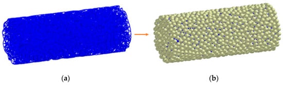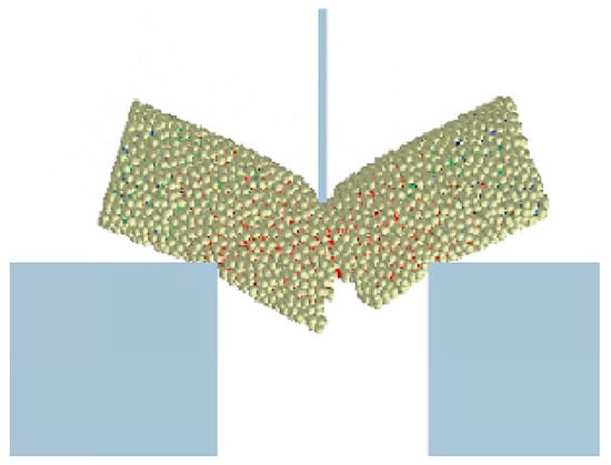 The cylindrical sample model with bonds is shown in Figure 5. First, particles were bonded into the cylindrical sample model. The cylinder was drawn in the EDEM software and filled with adhesive particles with a radius of 1 mm. The cylinder was then compressed with a plate until it reached the required size. After the cylinder became stable, the bond was formed according to its adhesive radius. The model was then imported into a new file, and the indenter and the support plate, which have the same sizes during the bending test as above, were subsequently input. The spacing of the support plate was 7 mm, and the tool moved down at a speed of 0.002 m/s []. To establish the walnut kernel bending test, the Hertz–Mindlin with a bonding contact model was used; the parameter range is presented in Table 2.