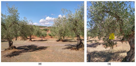 Example of olive-growing space environment complexity. (a) A picture of an olive-growing space and trees. (b) Detail of a trap fixed in the tree crop.