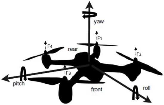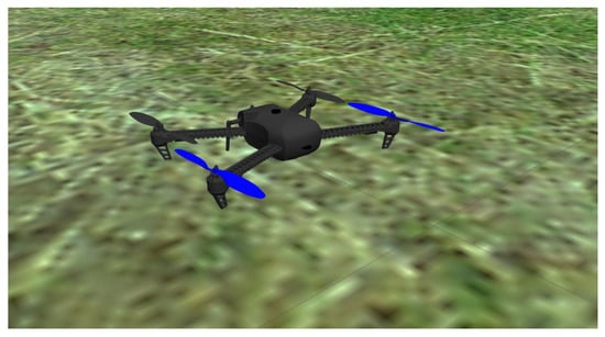 The dynamics of the UAV were provided by the PX4 package and are detailed and described in Andrade et al. [70]. The UAV system considered in this work has four rotors, as presented in Figure 3.