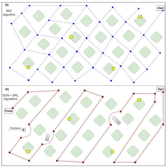 Overall idea of the proposed methodology. In Figure (a), the UAV starts the trajectory planning algorithm by exploring multiple path options in a complex and unstructured environment. Figure (b) illustrated when the RRT algorithm calculated all possible routes, and the optimized route planning was performed based on the DQN and DRL algorithms, making it possible to deal with changes in the environment in real-time.